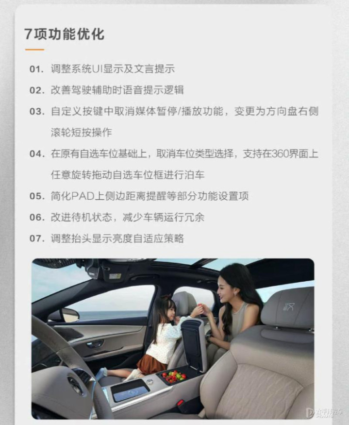 此外,还针对7项功能优化,包括调整系统UI显示及文言提示、改善驾驶辅助时语音提示逻辑、自定义按键中取消媒体暂停/播放功能,变更为方向盘右侧滚轮短按操作、在原有自选车位基础上,取消车位类型选择,支持在360界面上任意旋转拖动自选车位框进行泊车、简化PAD上侧边距离提醒等部分功能设置项、改进待机状态,减少车辆运行冗余、调整抬头显示亮度自适应策略。